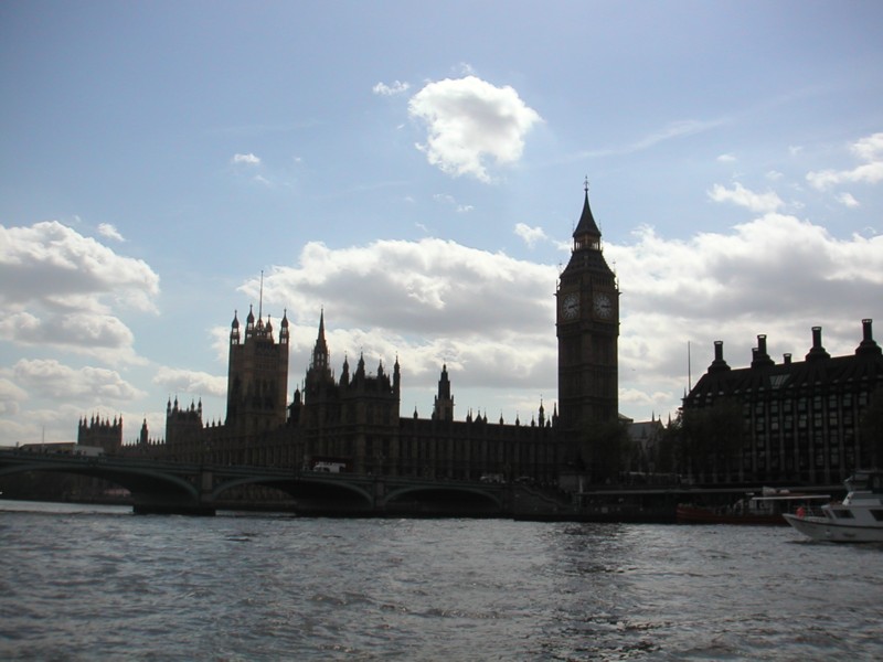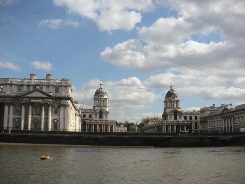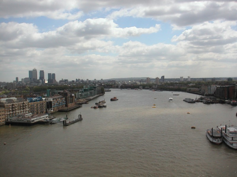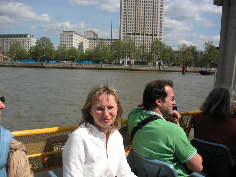 После собора, я подумала, что неплохо бы подкрепиться. Мне попался супермаркет, где я купила суши и фруктовый салат, но прежде чем мне удастся их поесть, пройдет еще несколько часов... Я хотела сделать это в парке, но парки, которые я знала, находились в другой части города, а я еще в этот день хотела покататься по Темзе. В эти 2 дня я стояла под давлением времени. Не успев вчера посетить по карточке все, что хотела, в это день я хотела успеть больше. Я отыскала (с суши в пакете и ужасным хотением в туалет) место отчаливания моего судна и увидела, что как раз пришла вовремя к отчаливанию, а если бы сначала пошла в туалет или есть, то мне пришлось бы еще 40 минут ждать, а они тоже заканчивают в 6. Поэтому я уселась на судно (это называлось катамаран) и поехала в круиз по Темзе. Солнышко светило, все было замечательно. Сзади меня сидели немецкие пенсионерки, я попросила одну из них меня сфотографировать, когда мы будем проезжать колесо обозрения. Но та явно не умела обращаться с фотоаппаратом, особенно цифровым и получилась ерунда, никакого колеса там не видно, я его тогда одна сфотографировала. Экскурсовод болтал на английском, сопровождая рассказ шуточками, но я поняла только четверть его рассказа. Я взяла самую длинную экскурсию, о чем потом пожалела, она была слишком длинной и на обратном пути поднялся такой ветер, что я совсем продрогла, а была одета в тот день легко. К тому же я была голодна и хотела в туалет.